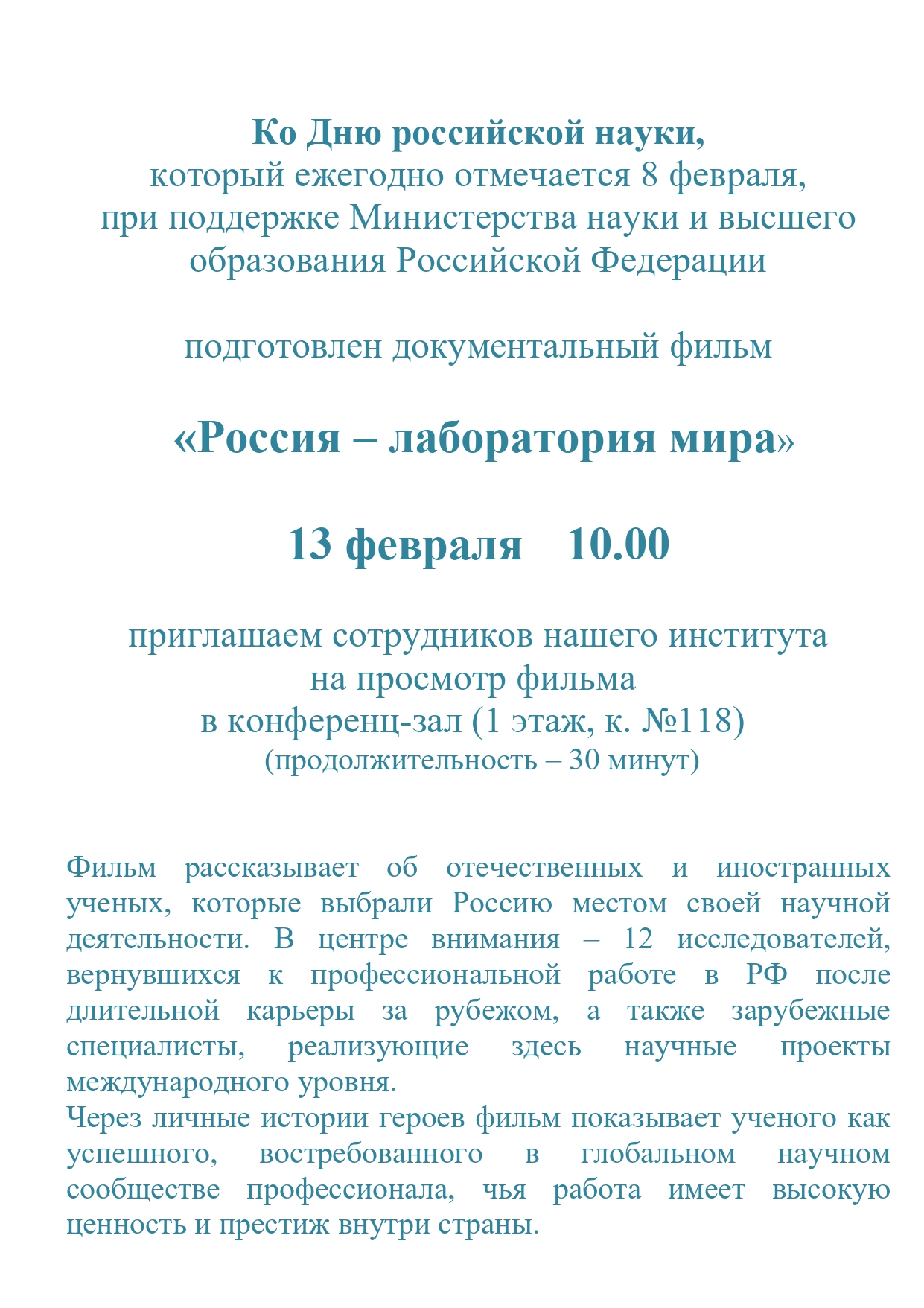 13.02.26г. в 1000 Просмотр фильма "Россия - лаборатория мира"